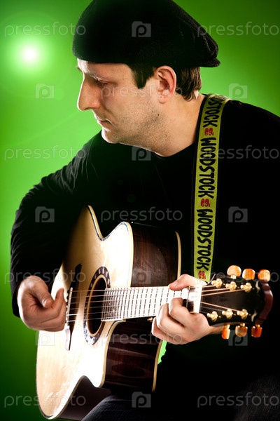 Мужчина с гитарой на зеленом фоне
