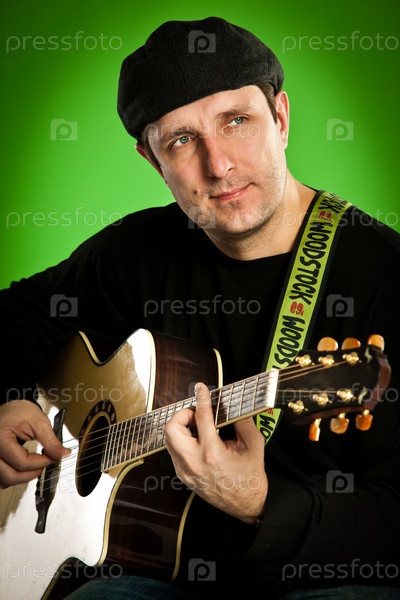 Мужчина с гитарой на зеленом фоне
