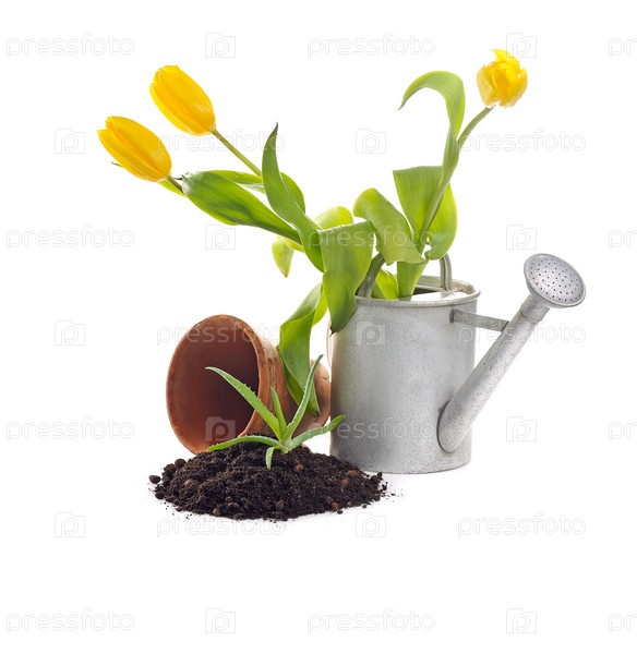 Глиняный горшок, металлическая лейка и рассада на белом фоне