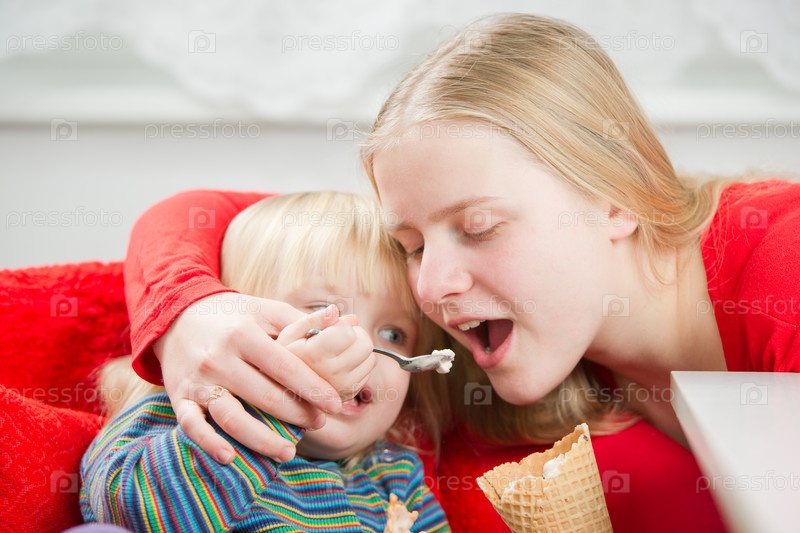 Мама с дочкой едят мороженое