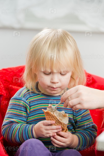 Мама кормит девочку мороженым