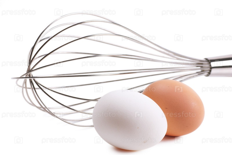 Венчик для взбивания и два яйца на белом фоне