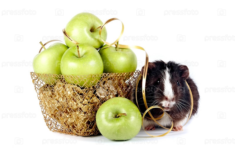 Морская свинка с зелеными яблоками в корзине на белом фоне