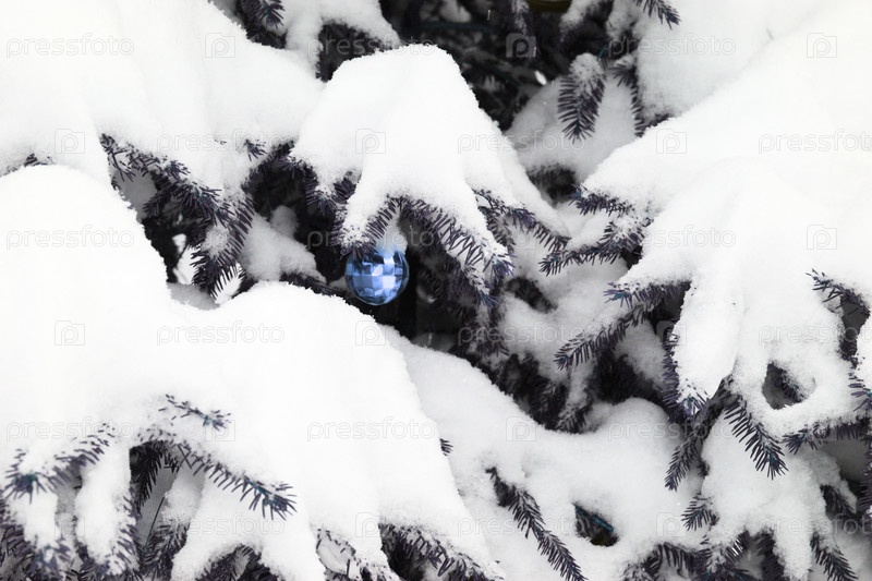 Синяя елочная игрушка на черно-белой елке