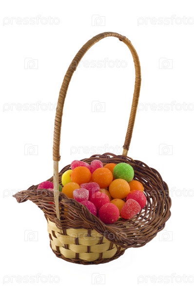 Красивая плетеная корзина с разноцветными сладостями