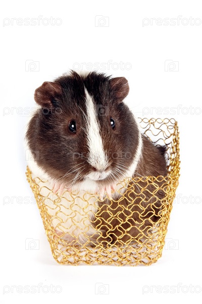Морская свинка в золотой корзиночке на белом фоне