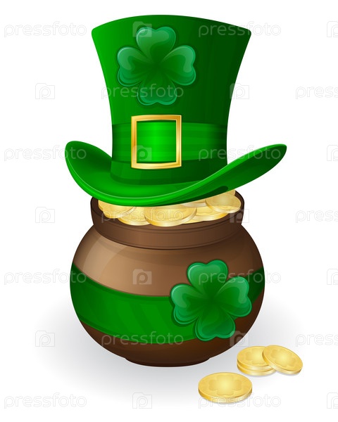 Иллюстрация для дня Святого Патрика. Зеленая шляпа с клевером и горшком с золотыми монетами