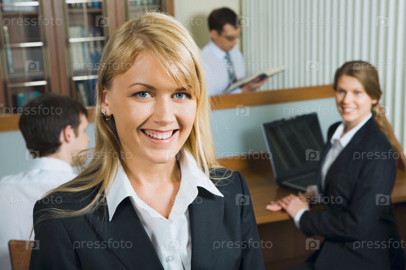 Молодая красивая улыбающаяся женщина в рабочей среде на фоне ее бизнес-команды