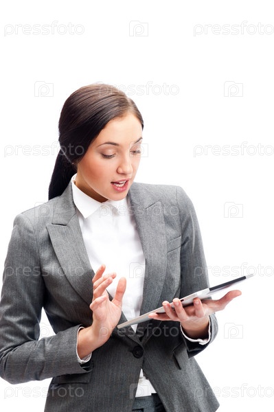Бизнес-леди с планшетным компьютером на белом фоне