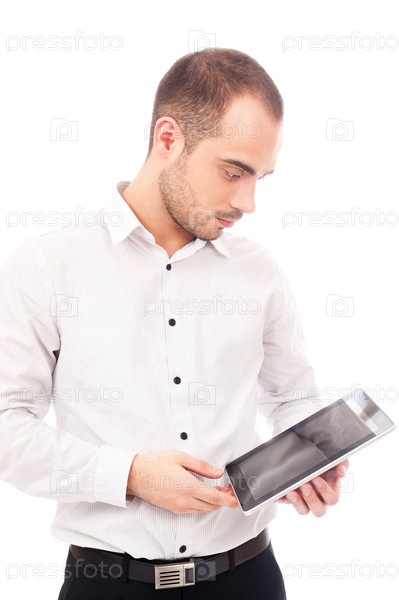 Красивый мужчина с планшетным компьютером на белом фоне