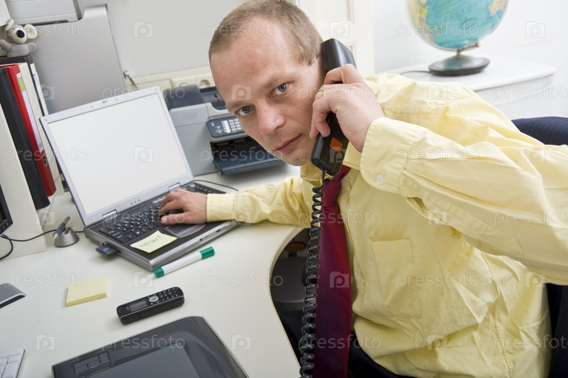 Бизнесмен одновременно разговаривает по телефону и печатает на клавиатуре