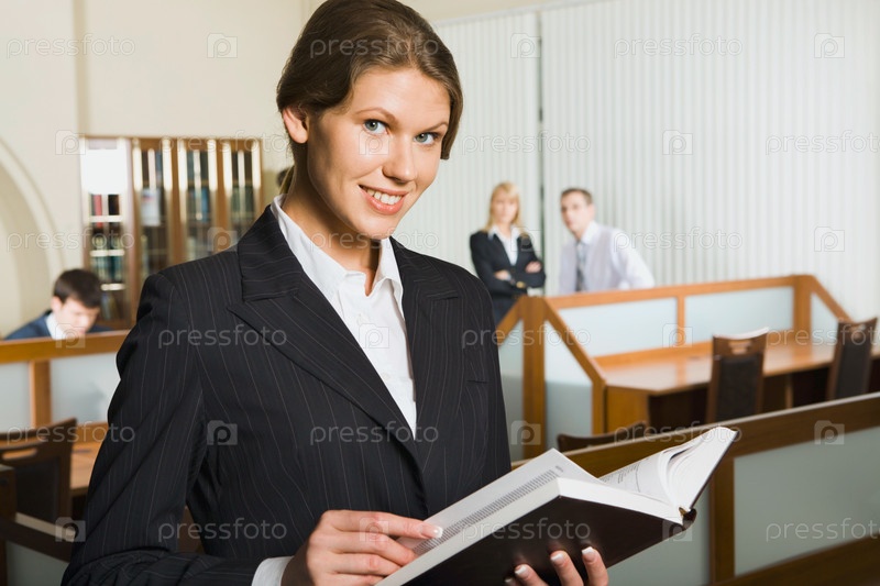 Привлекательная деловая женщина держит книгу в руке вместе со своими коллегами на фоне офиса