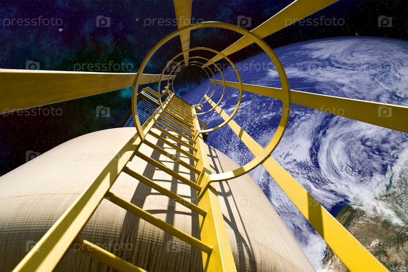 Крупный план лестницы на корабле в космическом пространстве. На заднем плане видна Земля