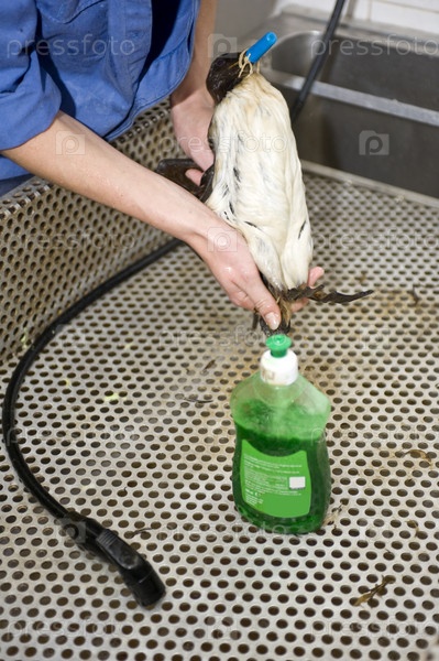 Очистка перьев кайры от нефти с помощью шланга и мыла