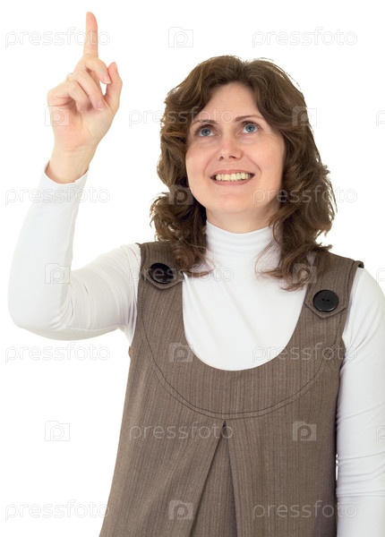 Молодая женщина показывает палец вверх на белом