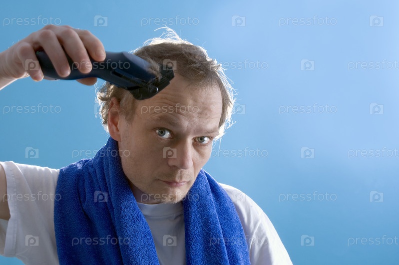 Мужчина среднего возраста сбривает волосы на голове с помощью машинки для стрижки волос