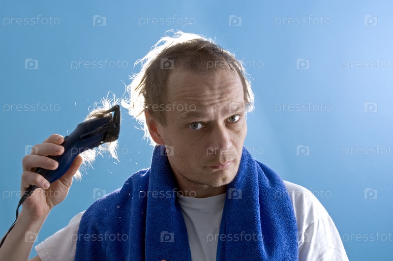 Мужчина среднего возраста сбривает волосы на голове с помощью машинки для стрижки волос