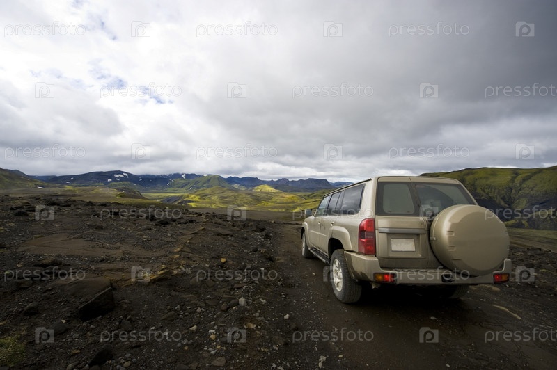 Автомобиль на лавовых полях в национальном парке в Исландии