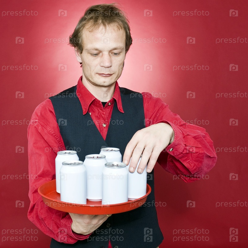 Официант переставляет напитки на подносе