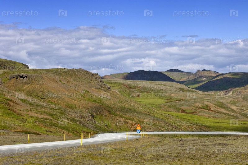 Дорога Исландии, окружающая остатки неактивных вулканов на южном побережье недалеко от Рейкьявика