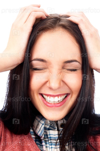 Смущенная смеющаяся женщина, изолированная на белом фоне