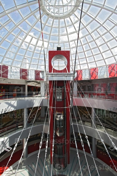 Огромный зал современного торгового центра со стеклянным лифтом, часами на полу и прозрачным стеклянным куполом