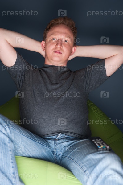 Портрет молодого человека, сидящего на мешке у себя дома и смотрящего телевизор