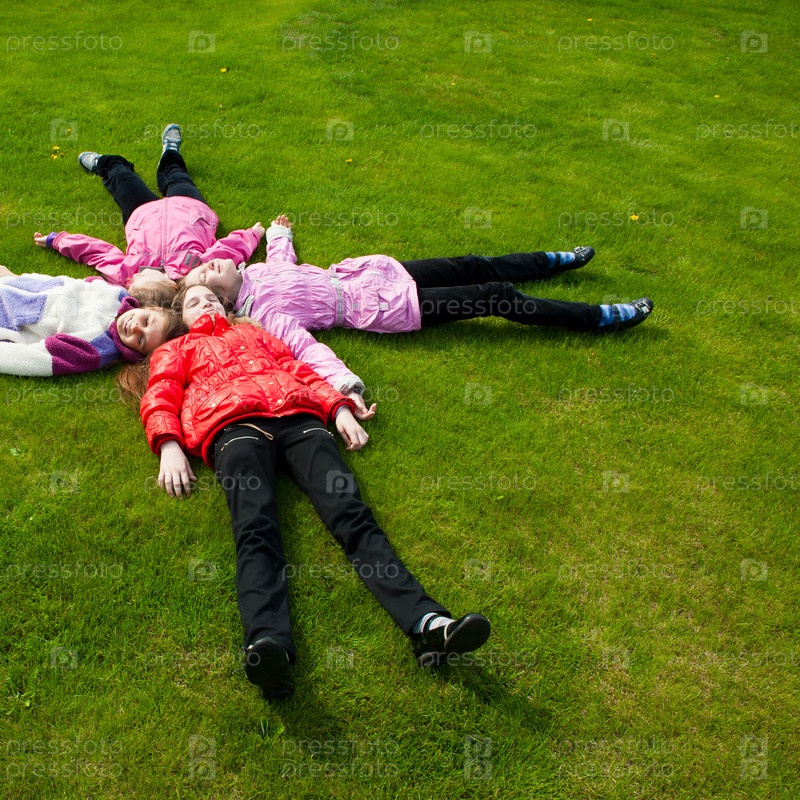 Веселые дети лежат на траве