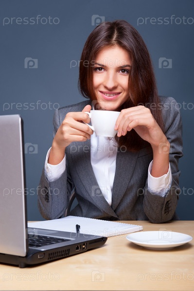 Улыбающаяся женщина с чашкой сидит за столом перед ноутбуком