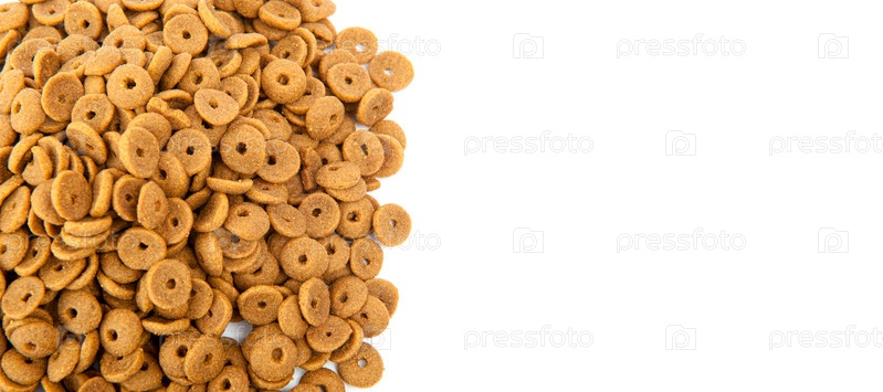 Сухой корм для животных, рассыпанный на белом фоне с местом для текста
