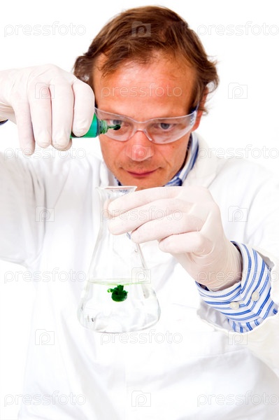 Химик, добавляет зеленый реагент в колбу