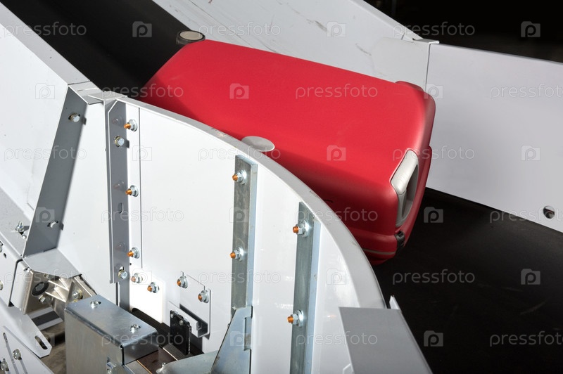 Красный чемодан на конвейерной ленте в аэропорту