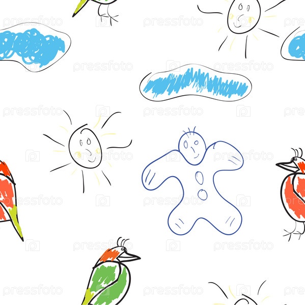 Бесшовные обои с детскими рисунками с солнцем и облаками