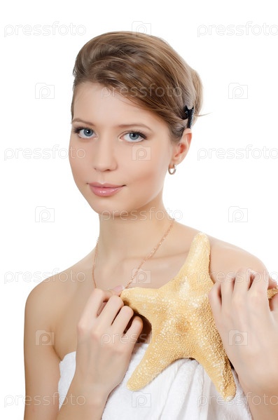 Молодая красивая девушка с морской звездой, изолированная на белом фоне