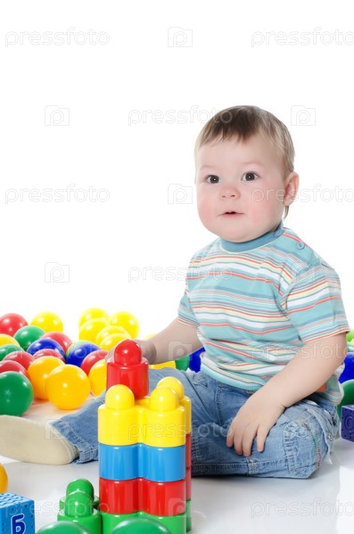 Маленький мальчик играет разноцветными игрушками