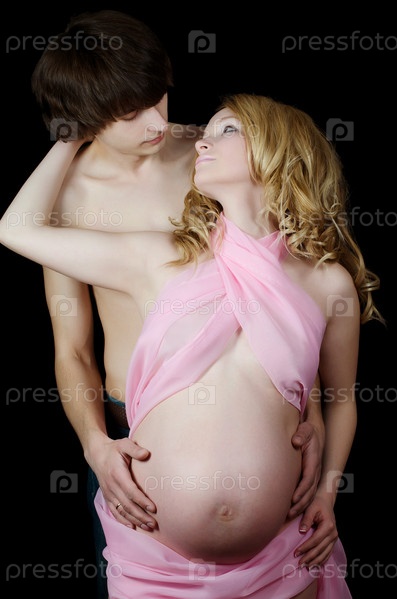 Беременная женщина и ее муж на черном фоне