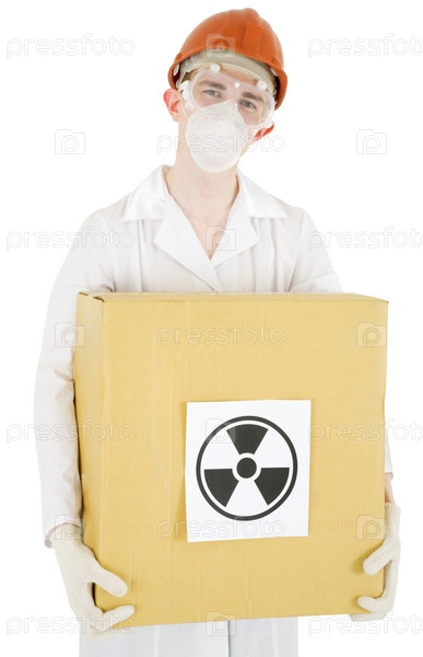 Человек в одежде ученого хранит картонную коробку с наклейкой знака радиации