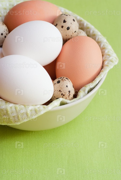 Куриные и перепелиные яйца крупным планом