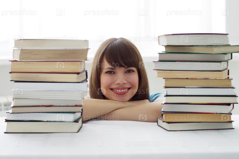 Лицо девушки и две стопки книг
