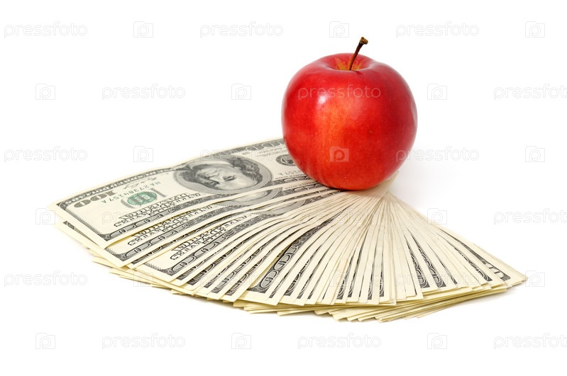 Яблоко и доллары, изолированные на белом фоне