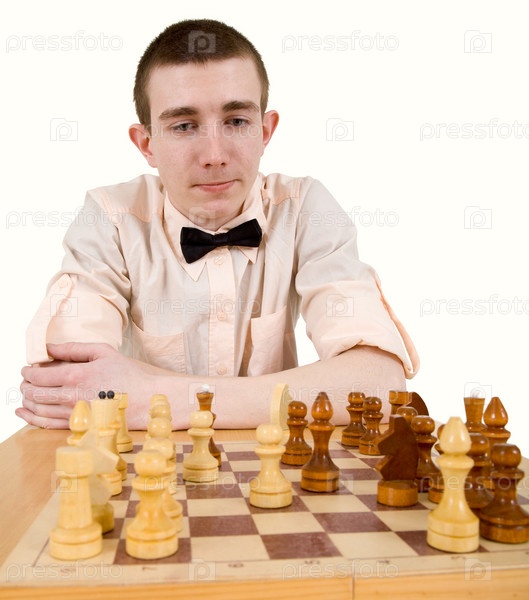 Мужчина смотрит на шахматы на белом фоне