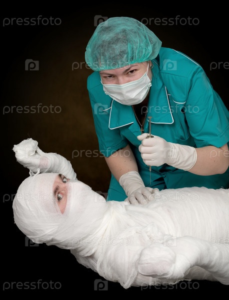 Врач сделает инъекцию повязанному пациенту
