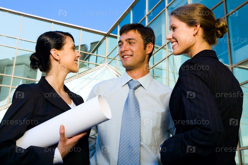 Портрет молодой брюнетки, держащей свиток рисунков и разговаривающей со своими коллегами за пределами большого бизнес-здания