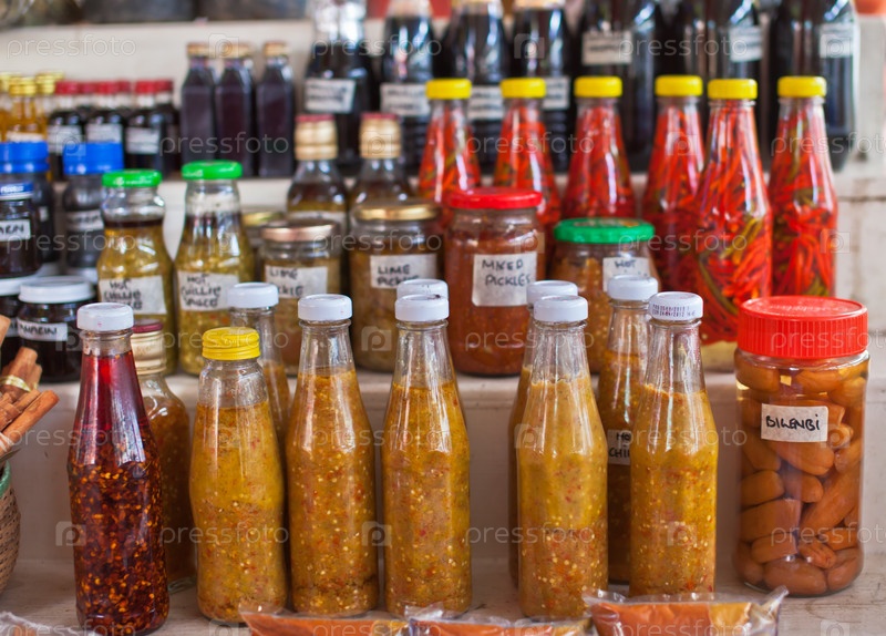Специи и соусы в бутылках на рынке
