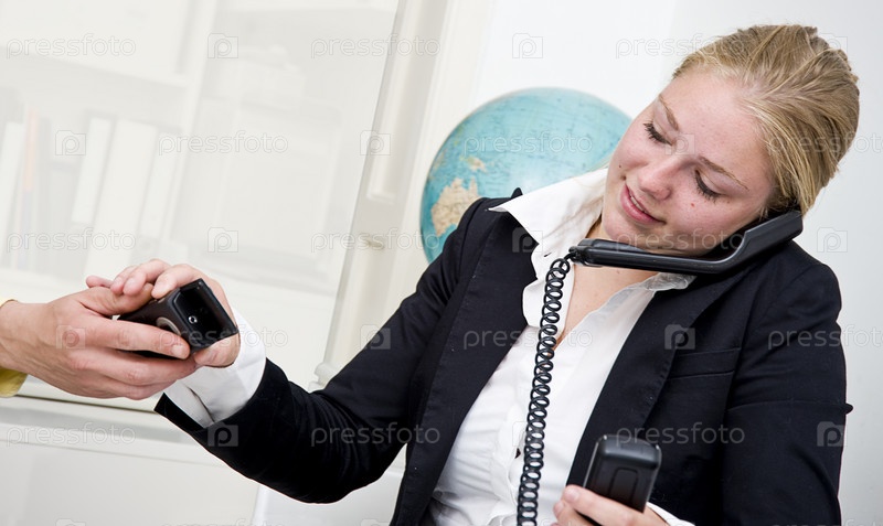 Бизнес-леди говорит по телефону по двум линиям и принимает третий звонок