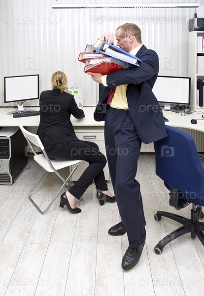 Бизнесмен несет стопку папок своей коллеге. которая организует свое рабочее место