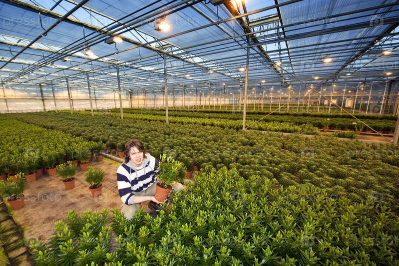 Человек стоит на коленях среди бесконечных рядов растений в теплице