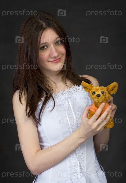 Портрет красивой молодой девушки с игрушечной собачкой на черном фоне
