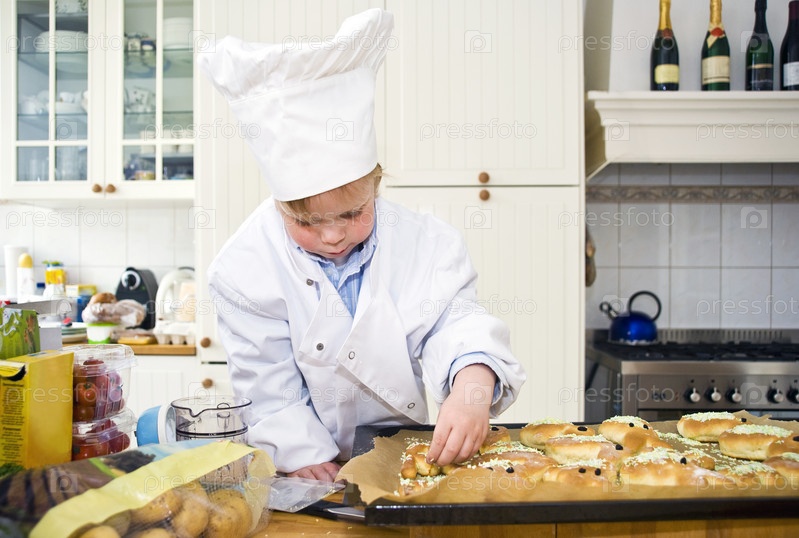 Маленький мальчик в форме шеф-повара готовит на кухне