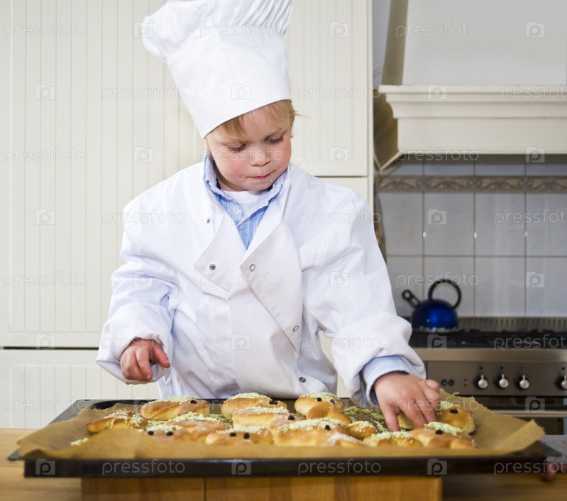 Маленький мальчик в форме шеф-повара готовит на кухне